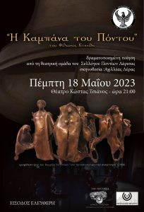 Στα πλαίσια των εκδηλώσεων μνήμης της Γενοκτονίας των Ελλήνων του Πόντου, ο Σύλλογος Ποντίων Λάρισας, παρουσιάζει, την Πέμπτη 18 Μαΐου 2023 και ώρα 21:00, στο Θεσσαλικό Θέατρο (Θέατρο Κώστας Τσιάνος) την «Η Καμπάνα του Πόντου» του Φίλωνος Κτενίδη. Η παράσταση τελεί υπό την αιγίδα του Δήμου Λαρισαίων και της Αντιδημαρχίας Πολιτισμού με την ευγενική συμπαράσταση του Θεσσαλικού Θεάτρου. Η είσοδος είναι ελεύθερη προς το κοινό (δωρεάν).