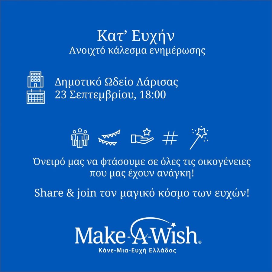 Την Παρασκευή 23 Σεπτεμβρίου και ώρα 18:00, το Κάνε-Μια-Ευχή Ελλάδος, με την υποστήριξη της Αντιδημαρχίας Πολιτισμού και Επιστημών Δήμου Λαρισαίων και το Δημοτικό Ωδείο Λάρισας, σας προσκαλεί σε μια ενημέρωση «Κατ’ Ευχήν» που θα πραγματοποιηθεί στον χώρο του Δημοτικού Ωδείου Λάρισας. Σας περιμένουμε για να σας συστήσουμε το έργο μας και να γνωρίσετε τον μαγικό κόσμο των ευχών!