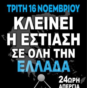 Πανελλαδική 24ωρη απεργία πραγματοποιούν σήμερα οι ιδιοκτήτες και οι εργαζόμενοι στον κλάδο της εστίασης, καλώντας όλους τους επαγγελματίες του κλάδου να μην λειτουργήσουν τα καταστήματά τους.